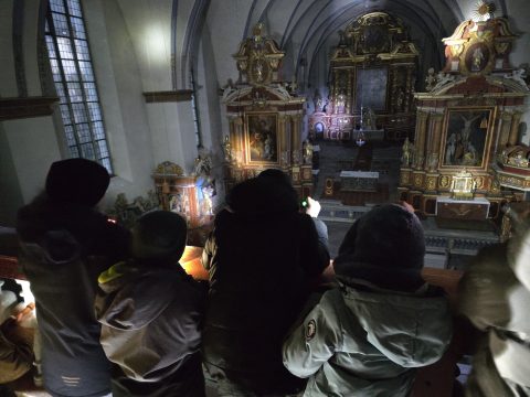 Nach Erkundung der Sakristei samt Empore mit den Hochalter-Bildern versammeln sich die Kinder mit ihren Taschenlampen vor dem Tabernakel mit dem Leib Christi. Nach einem gemeinsamen „Vater unser“ um den Altar herum verlassen sie die Kirche, die sie im mystischen Zauber der Dunkelheit, aber auch in ihrer Ausstrahlung als Ort des Glaubens erlebt haben.