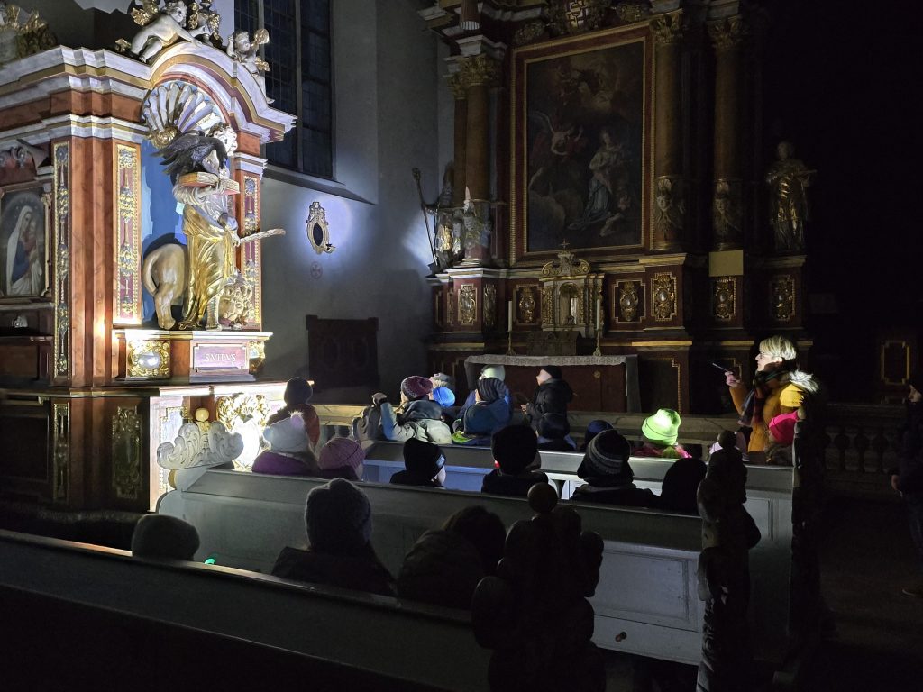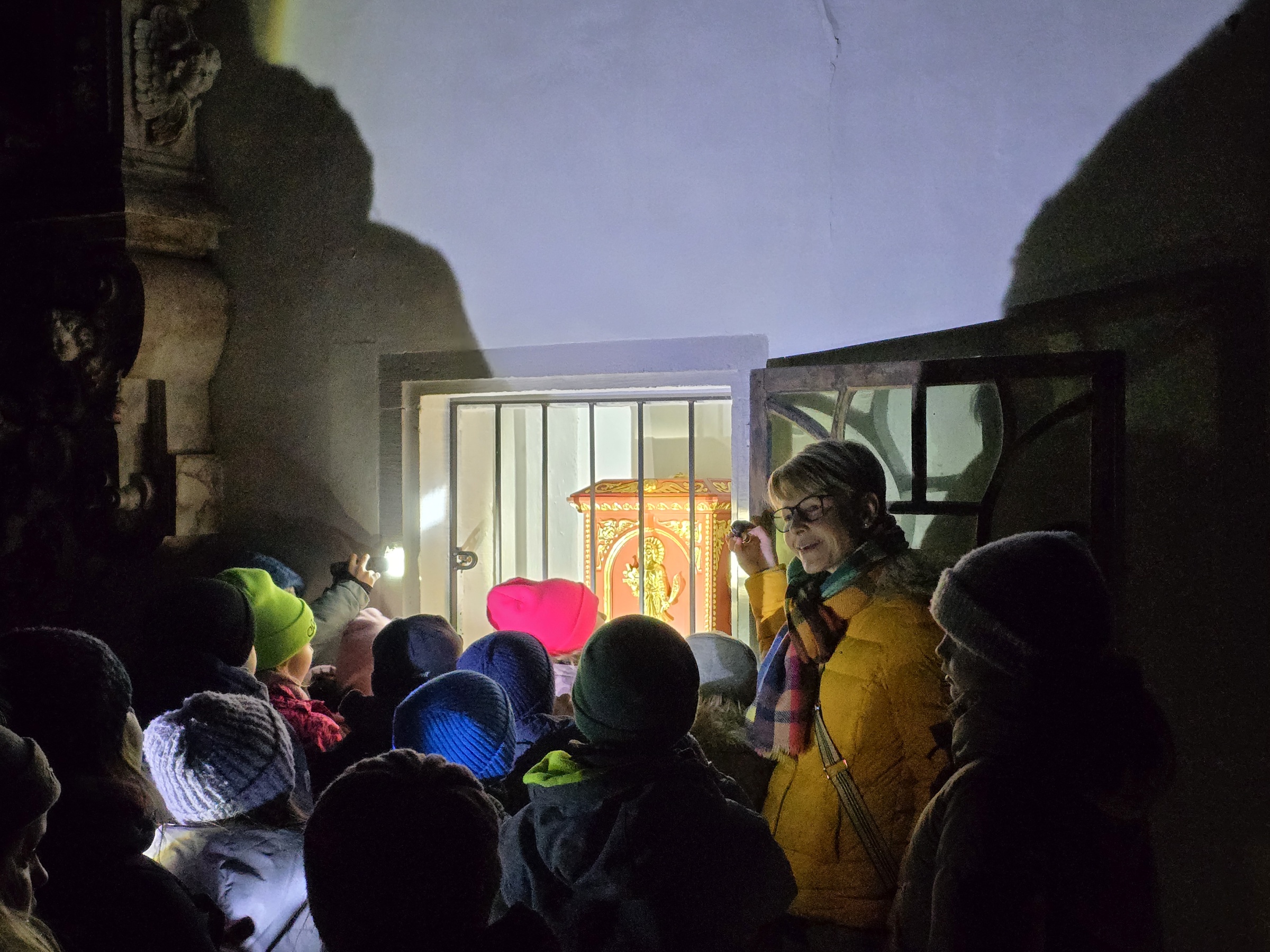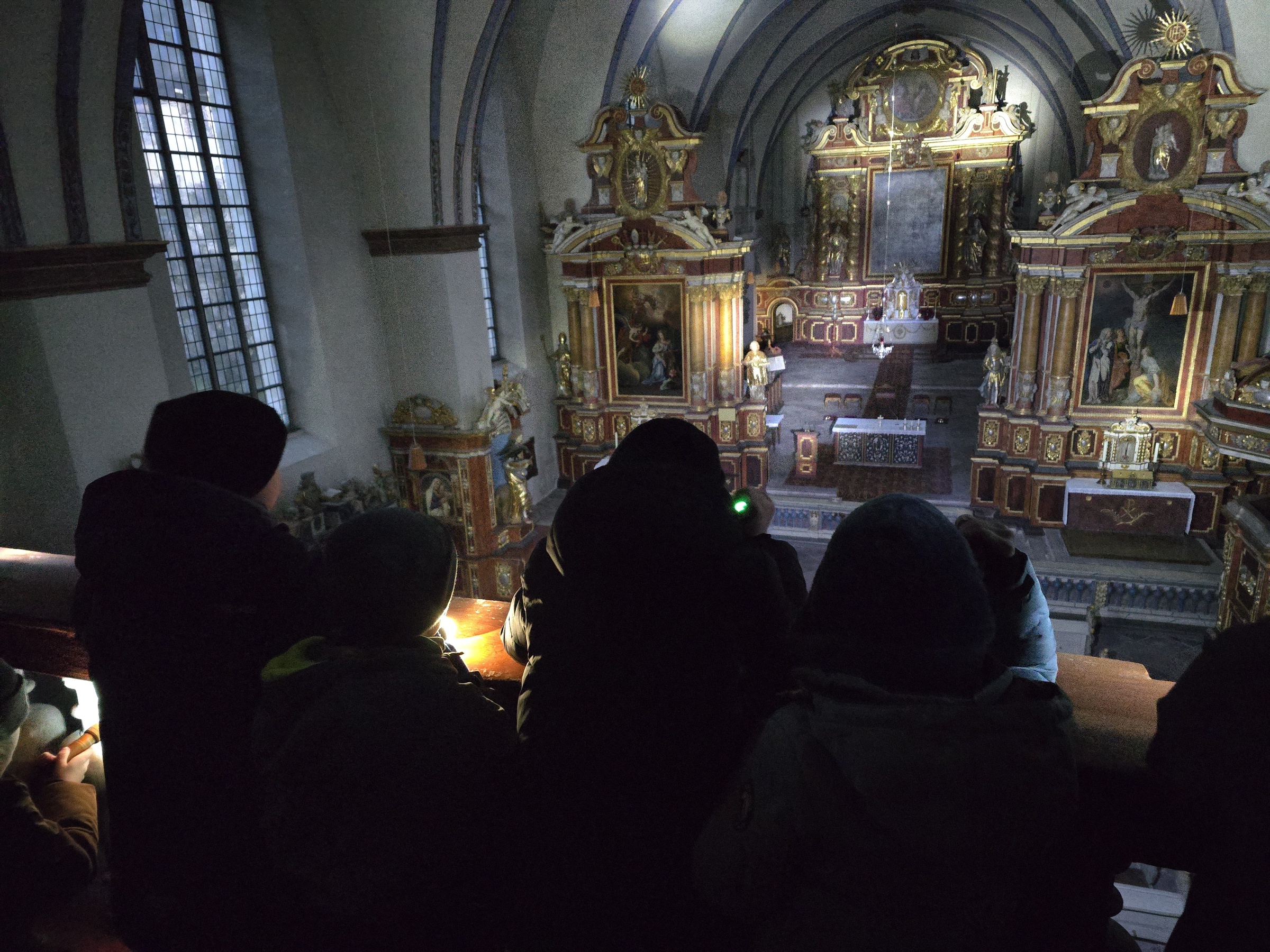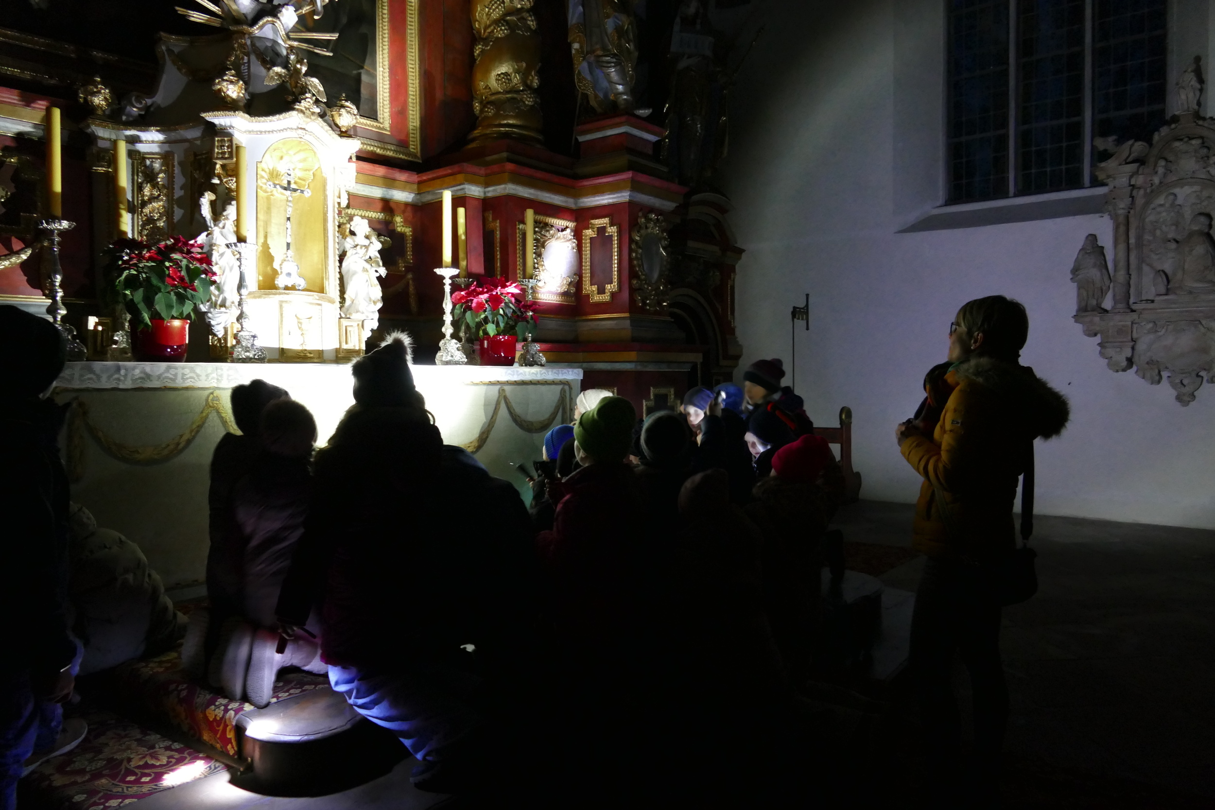 Nach Erkundung der Sakristei samt Empore mit den Hochalter-Bildern versammeln sich die Kinder mit ihren Taschenlampen vor dem Tabernakel mit dem Leib Christi. Nach einem gemeinsamen „Vater unser“ um den Altar herum verlassen sie die Kirche, die sie im mystischen Zauber der Dunkelheit, aber auch in ihrer Ausstrahlung als Ort des Glaubens erlebt haben.