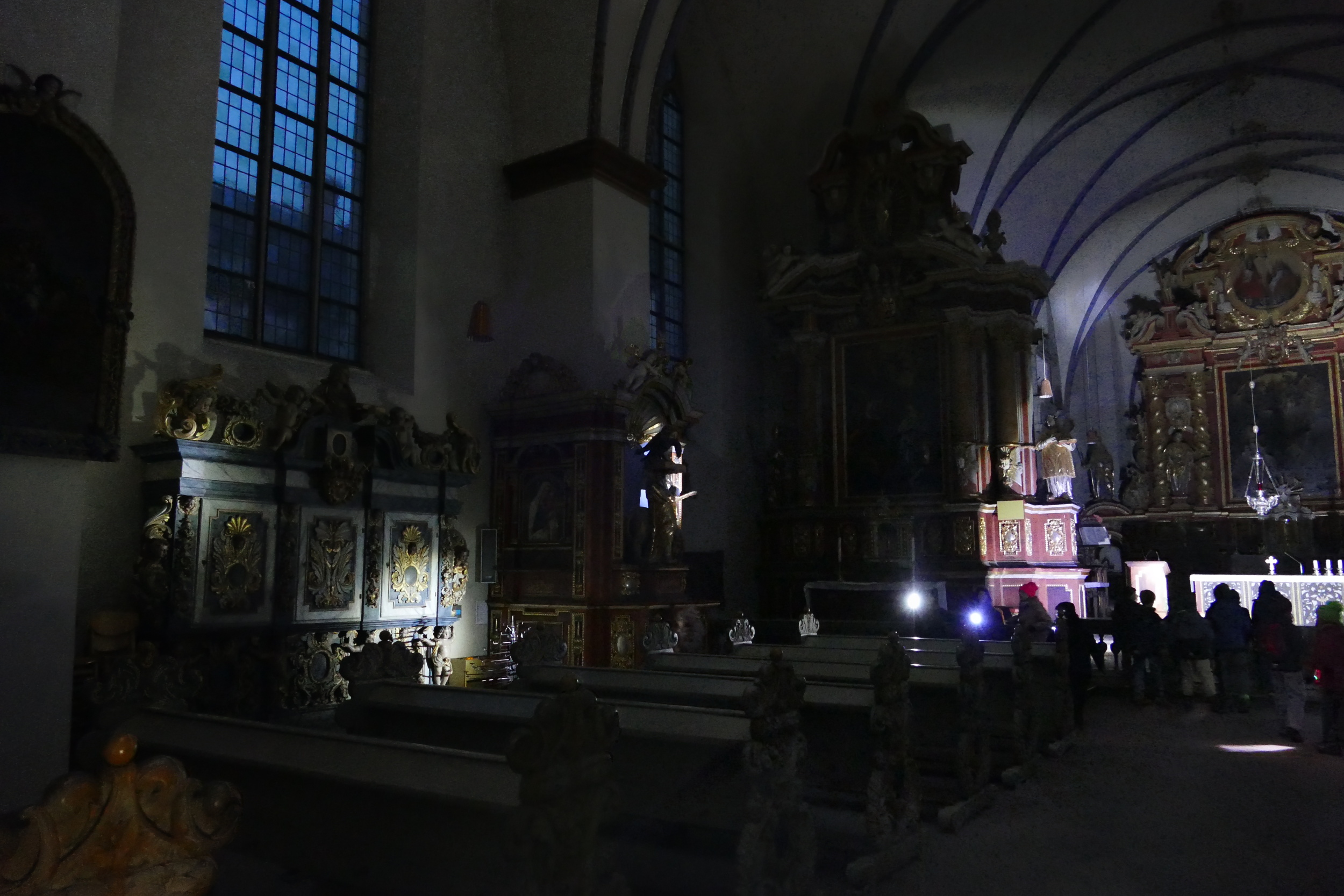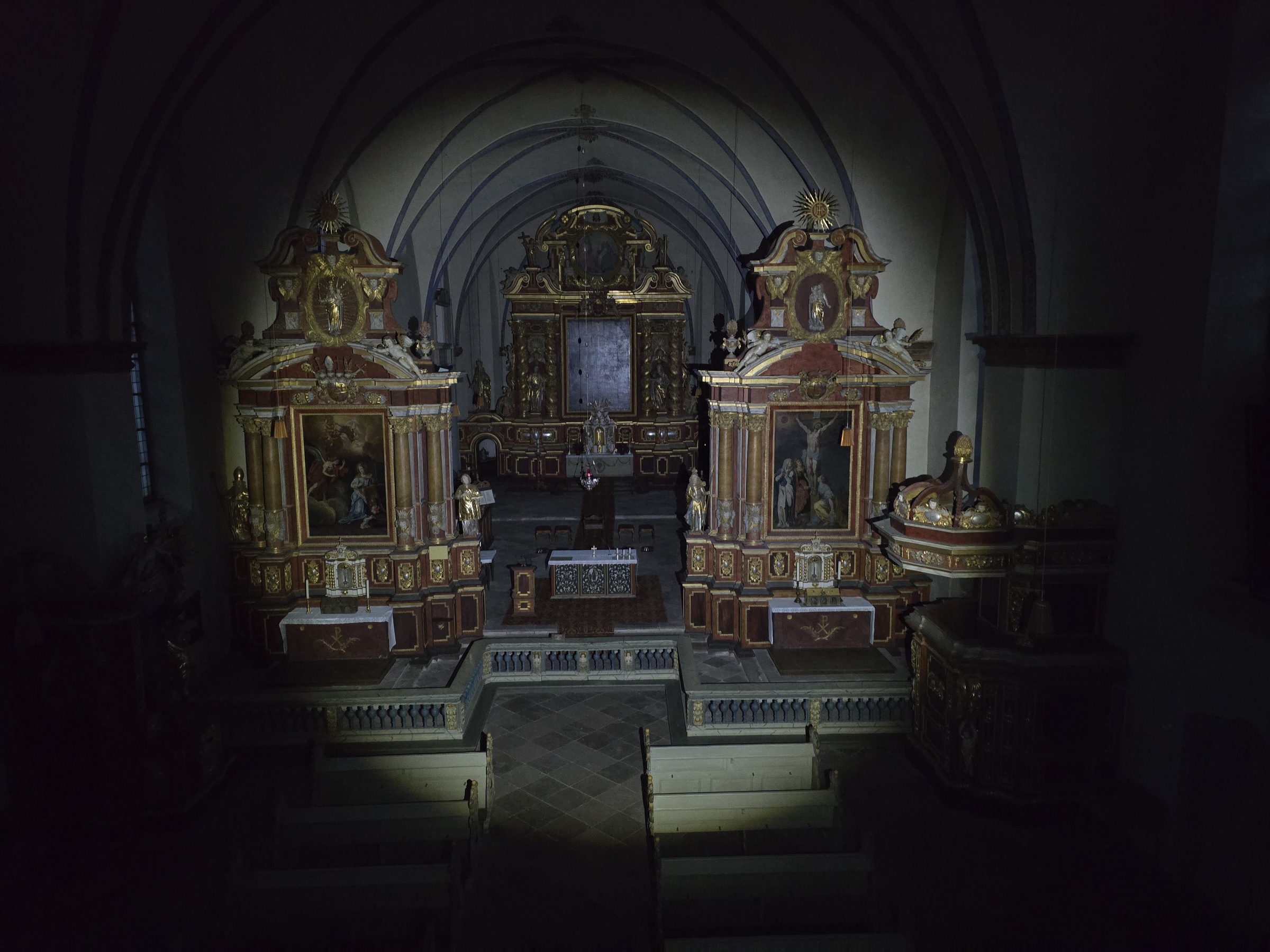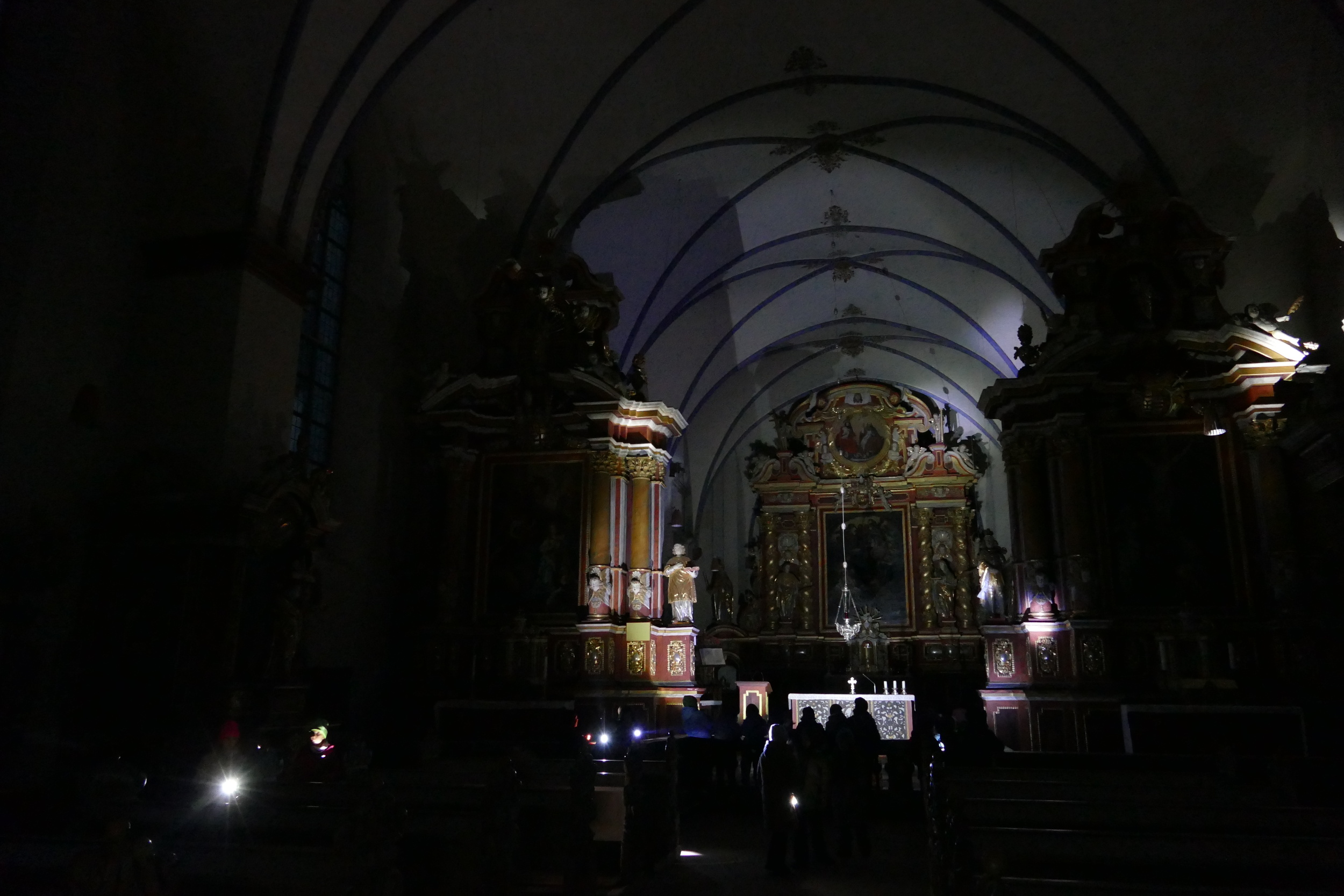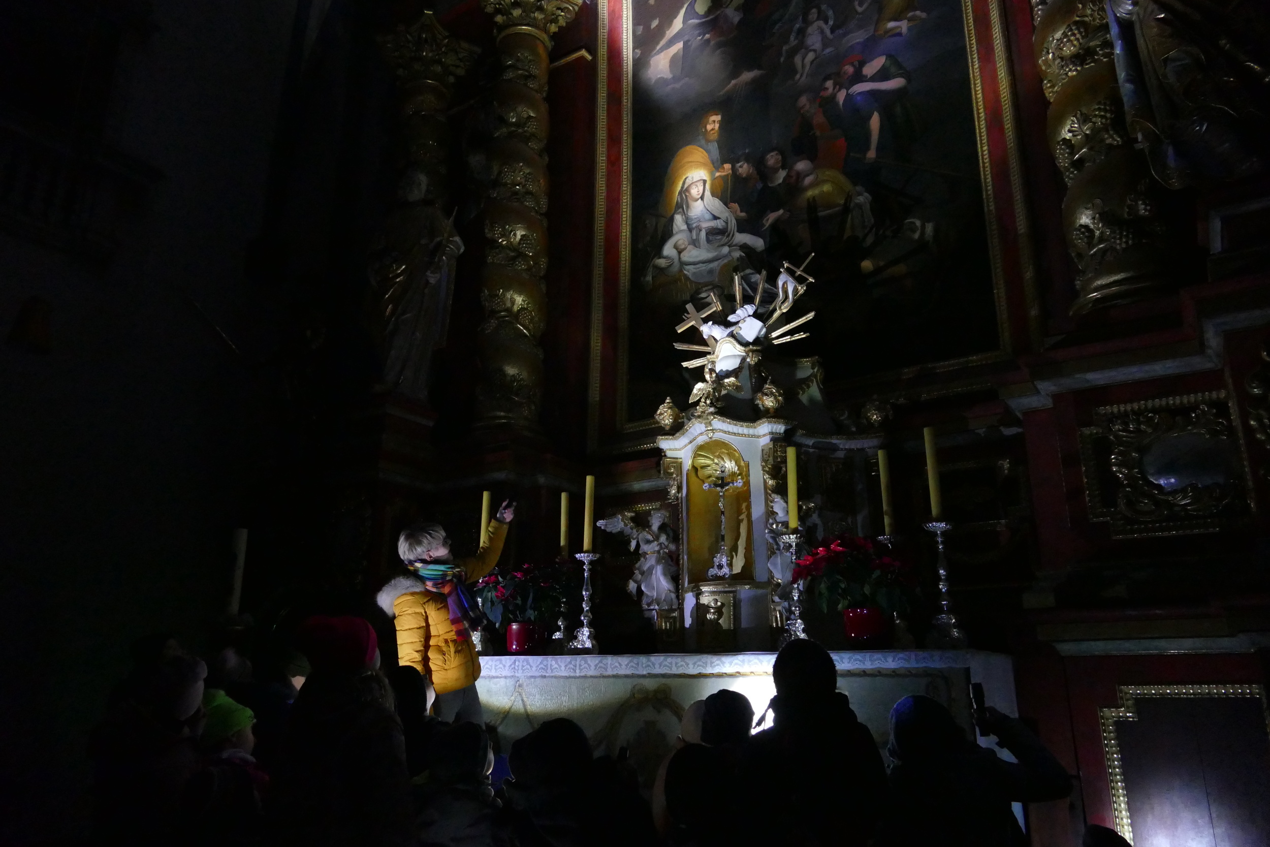 Nach Erkundung der Sakristei samt Empore mit den Hochalter-Bildern versammeln sich die Kinder mit ihren Taschenlampen vor dem Tabernakel mit dem Leib Christi. Nach einem gemeinsamen „Vater unser“ um den Altar herum verlassen sie die Kirche, die sie im mystischen Zauber der Dunkelheit, aber auch in ihrer Ausstrahlung als Ort des Glaubens erlebt haben.