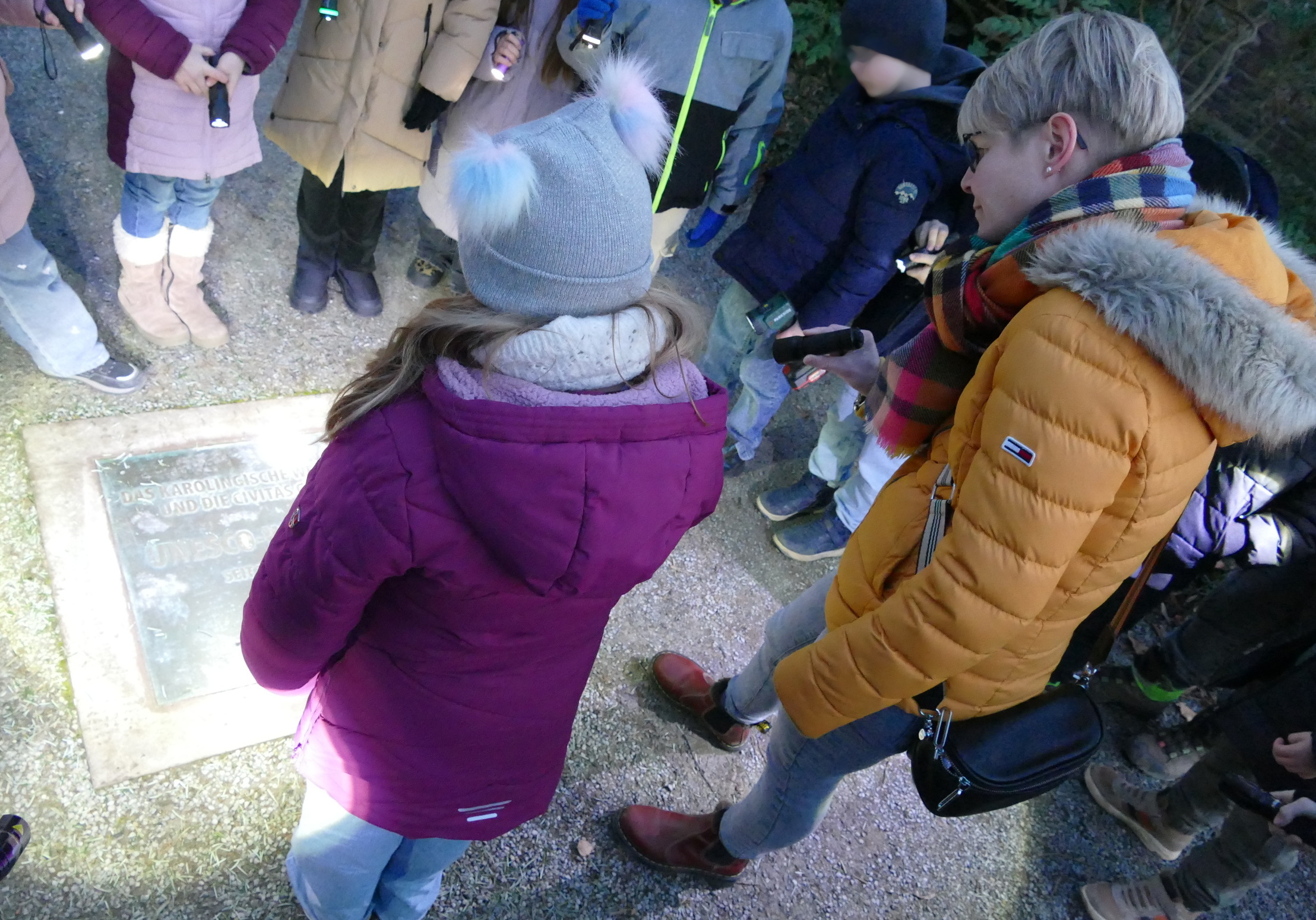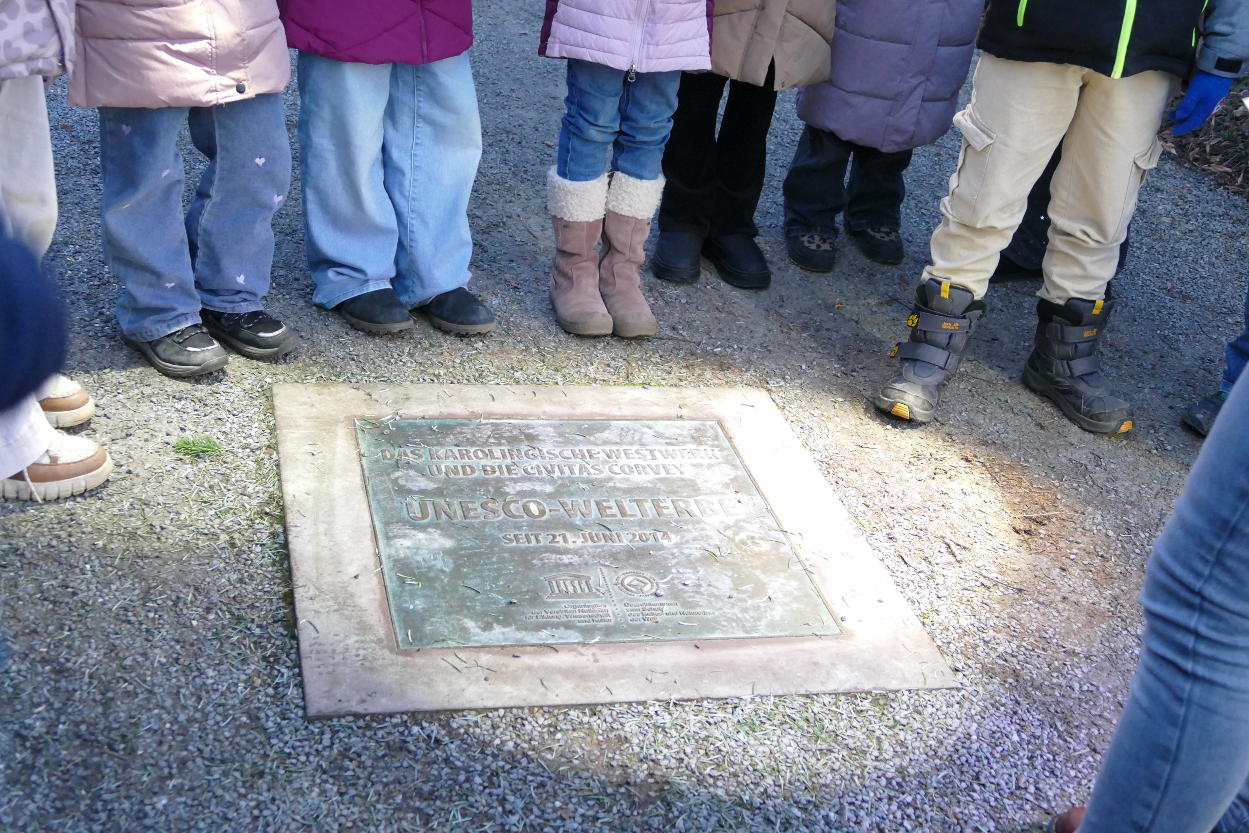 Marion Dinand teilt die Mädchen und Jungen an diesem kalten, aber sternenklaren Winterabend in drei Gruppen ein und führt sie nacheinander. Die vielen Taschenlampen richten sich draußen zuerst nach unten – auf die in den Boden vor dem Westwerk eingelassene Plakette. Sie kündet von der Welterbe-Anerkennung des Westwerks und des als Bodendenkmal erhaltenen mittelalterlichen Klosterbezirks, der Civitas, im Jahr 2014. Ein Kind liest vor, was auf der Plakette geschrieben steht. Angeregt von Marion Dinand stellt die Gruppe sich vor, wie maßgeblich das Kloster am Weserbogen die Stadt Höxter und die umliegenden Dörfer geprägt hat. Erstauntes Schweigen breitet sich aus.