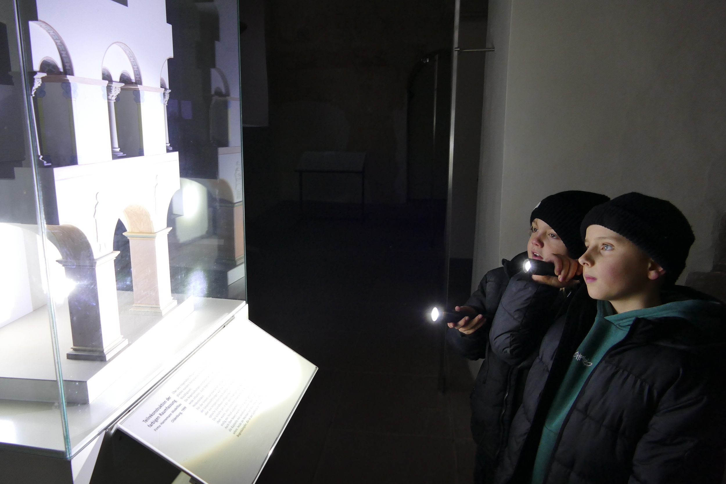 Das Westwerk im Modell: Auch bei den jungen Corvey-Entdeckern mit ihren Taschenlampen finden die Modelle im Johanneschor Interesse.