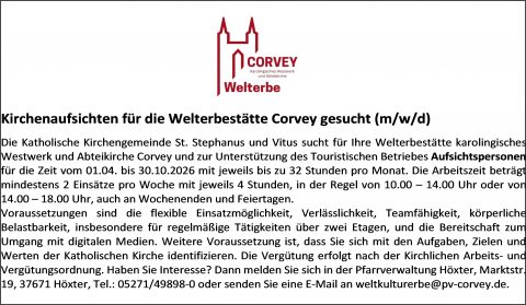 Mit diesen und weiteren Aufgaben unterstützen die Aufsichten den touristischen Betrieb in Westwerk und Abteikirche. Die Frauen und Männer sind allesamt Botschafterinnen und Botschafter Corveys. Über praktische Fragen und Absprachen hinaus haben sie immer ein nettes Wort für die Gäste – verpacken Informationen über das Welterbe in herzliche Dialoge.
