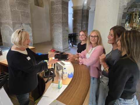 Die Tablets geben die Kirchenaufsichten der Gemeinde den Gästen mit auf den Weg. Zuvor händigen sie ihnen auch die Headsets für die Filmprojektion aus. Um die Reinigung sämtlicher Geräte nach jeder Nutzung kümmern sie sich auch. Im Blick hat der oder die Diensthabende auch immer die Luftentfeuchter zur Regulierung des Klimas im Erdgeschoss und im Johannischor des Westwerks.