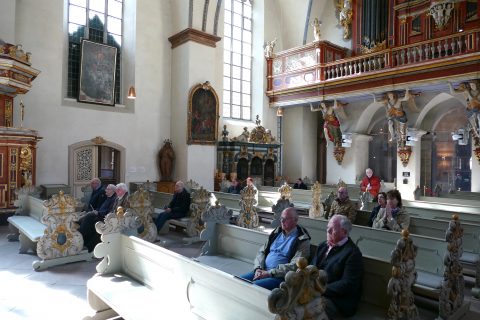 Nicht nur traurige, sondern auch glückliche Lebenssituationen möchten die Gäste nach dem Gebet gerne teilen. So wie das Ehepaar, das auf Vorbeter Erwin Winkler zuging. Die beiden erzählten ihm freudestrahlend, dass sie sich in Höxter kennengelernt hatten und jetzt zum Hochzeitstag Corvey besuchten. Welch glückliche Fügung, dass das Mittagsgebet sie nun einlud, ihre Freude vor Gott zu bringen. Aus Hildesheim saßen an einem Mittwoch „Benediktiner in Zivil“, so Erwin Winkler, in der Bank. Aufgefallen sind sie ihm, weil sie die Psalmen auswendig mitgesungen haben.