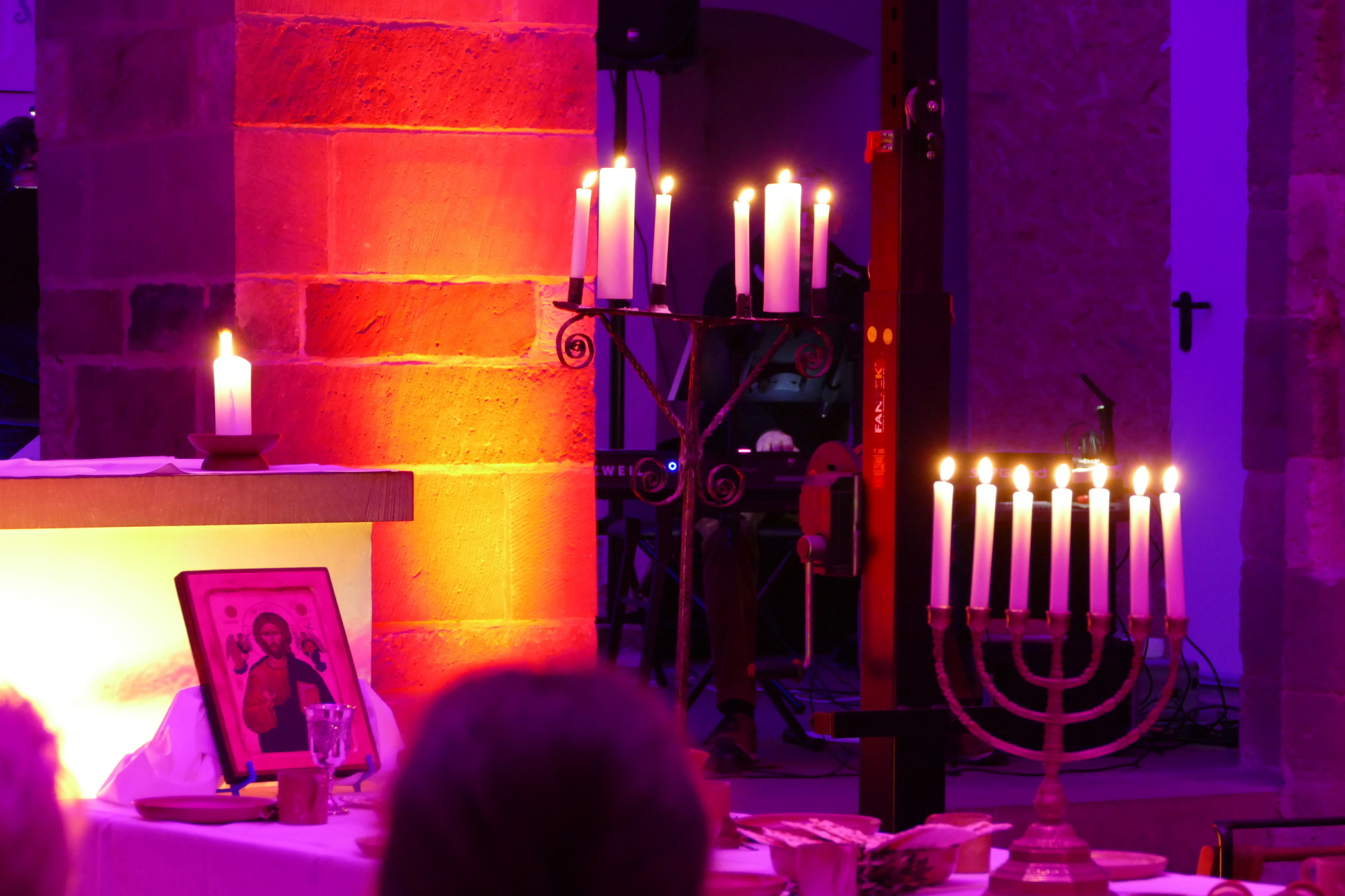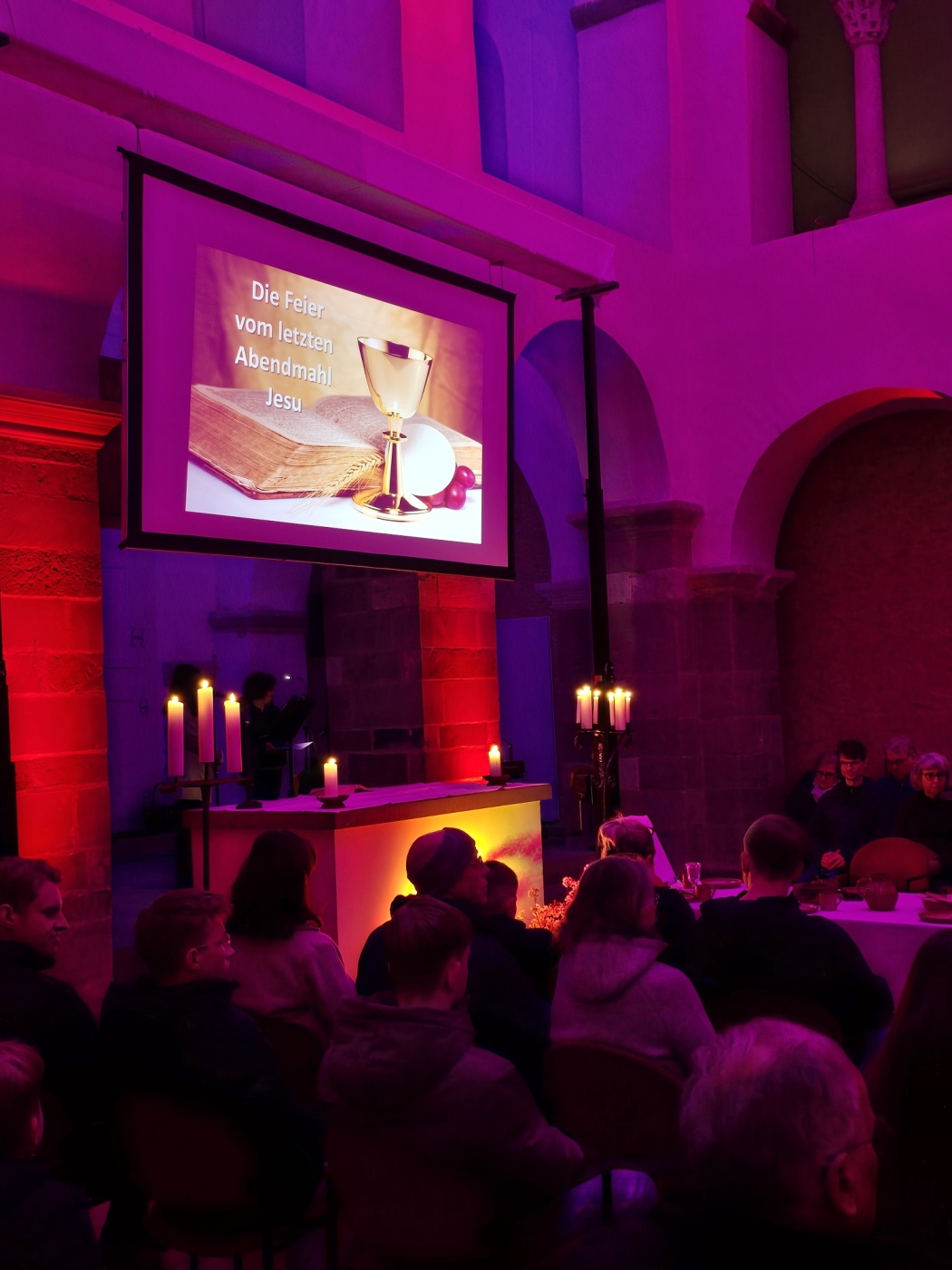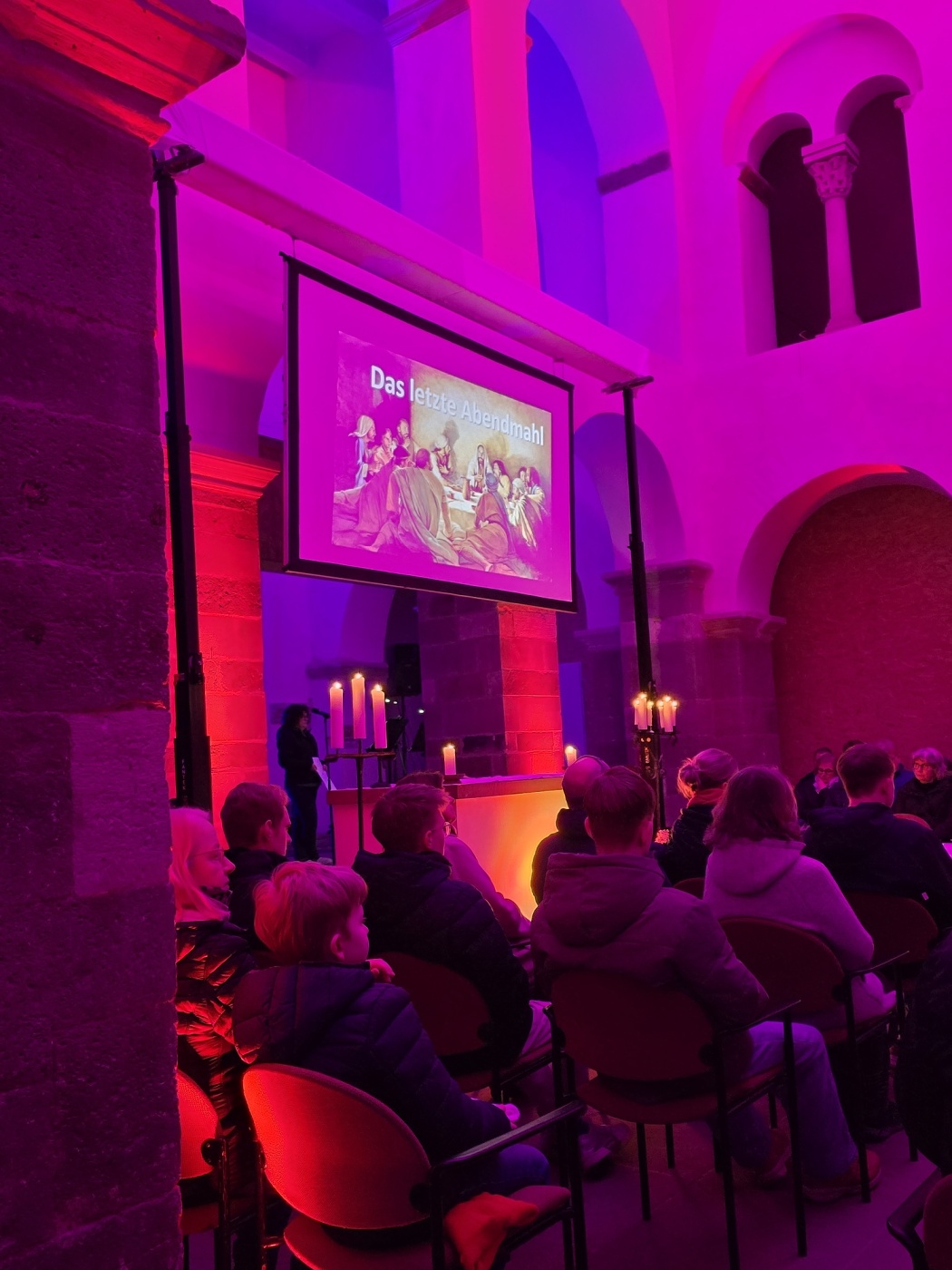 Eine augenfällige Brücke in die Gegenwart – die Beleuchtung – berührte die Gäste am Gründonnerstag direkt beim Betreten des Johanneschores. Das Team um Pastor Nal und Gemeindereferent Sperling hatte die Emporenkirche in ein mehrfarbiges, stimmungsvolles Licht getaucht und den Altar um einen festlich geschmückten Abendmahlstisch erweitert – einladend und mit den Symbolen gedeckt, die an die Befreiung des Volkes Israel aus der Sklaverei in Ägypten erinnern. Auch Brot und Wein standen für das Paschamahl bereit. Jesus feierte es mit seinen Jüngern, bevor er seinen Leidensweg antrat.