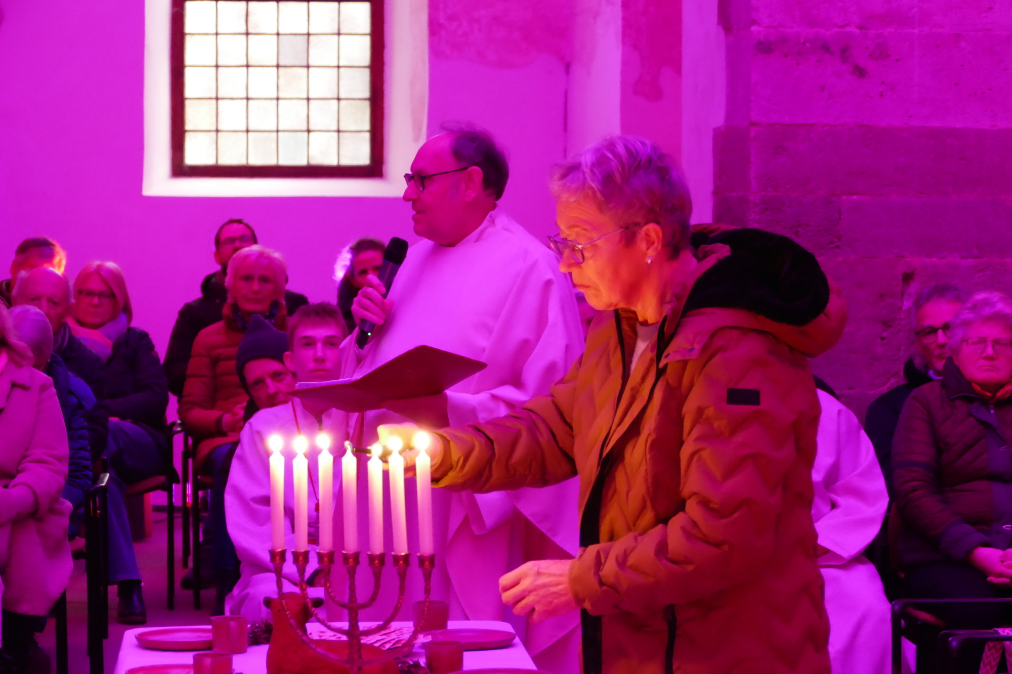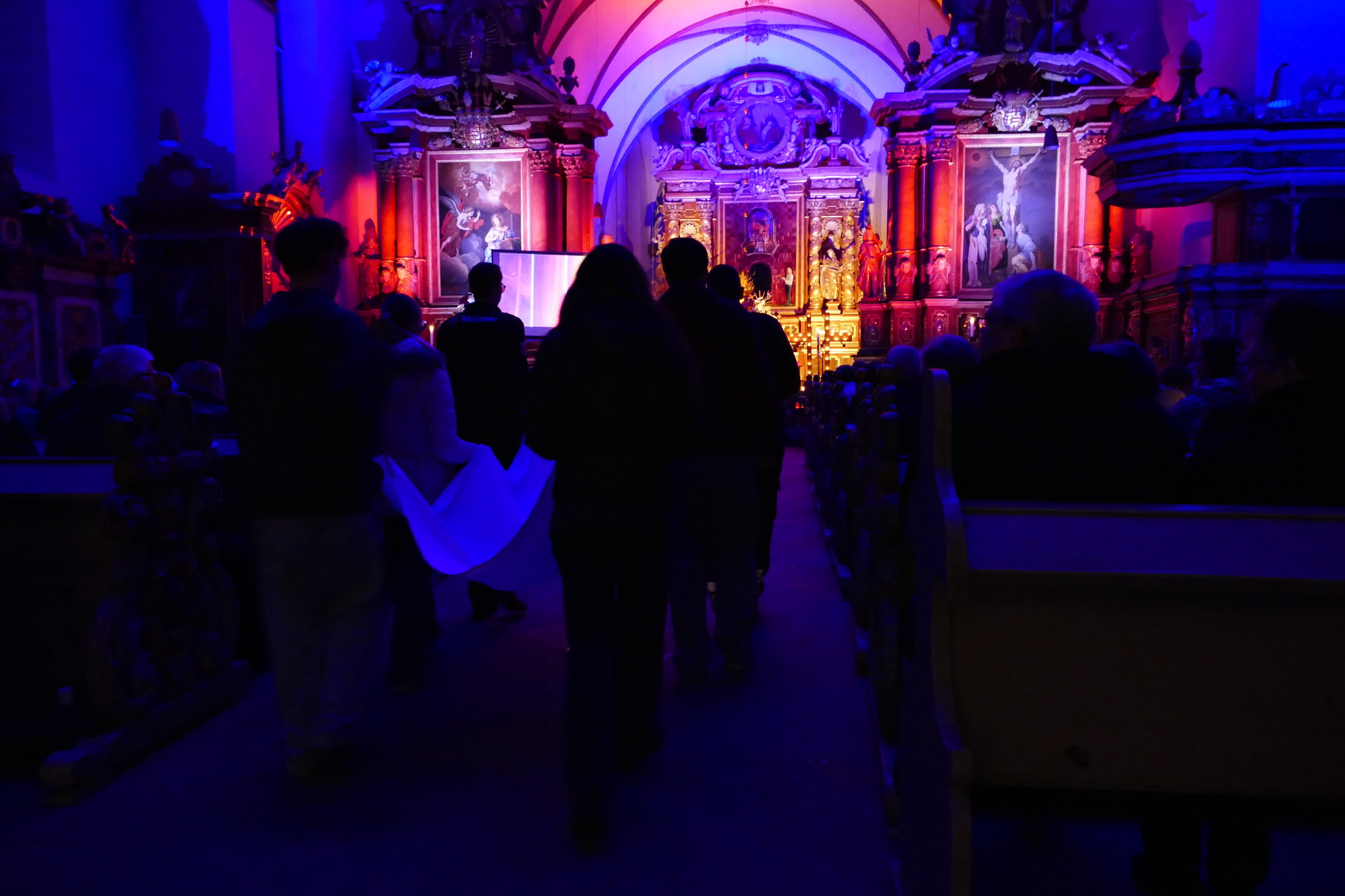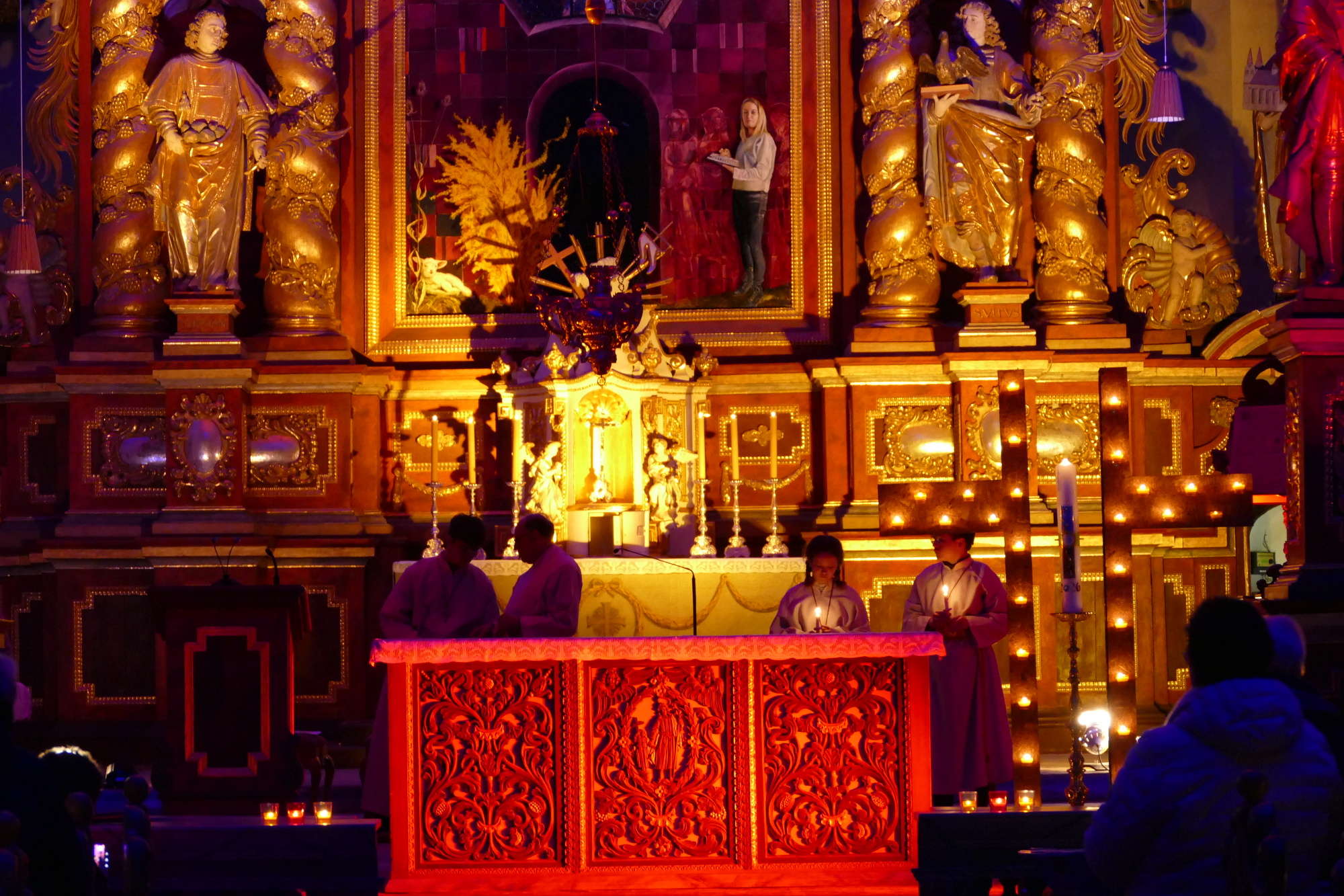 Eine augenfällige Brücke in die Gegenwart – die Beleuchtung – berührte die Gäste am Gründonnerstag direkt beim Betreten des Johanneschores. Das Team um Pastor Nal und Gemeindereferent Sperling hatte die Emporenkirche in ein mehrfarbiges, stimmungsvolles Licht getaucht und den Altar um einen festlich geschmückten Abendmahlstisch erweitert – einladend und mit den Symbolen gedeckt, die an die Befreiung des Volkes Israel aus der Sklaverei in Ägypten erinnern. Auch Brot und Wein standen für das Paschamahl bereit. Jesus feierte es mit seinen Jüngern, bevor er seinen Leidensweg antrat.