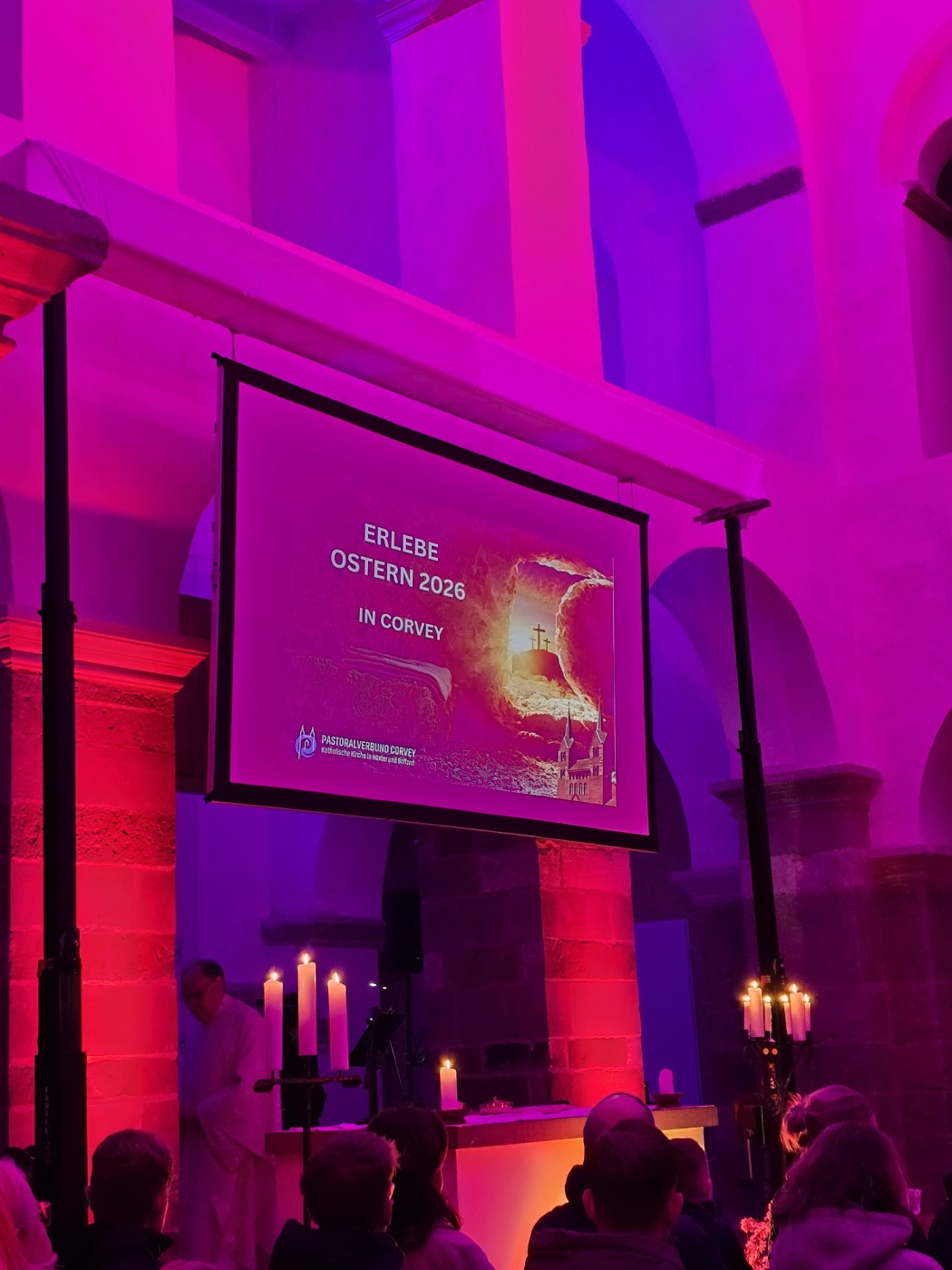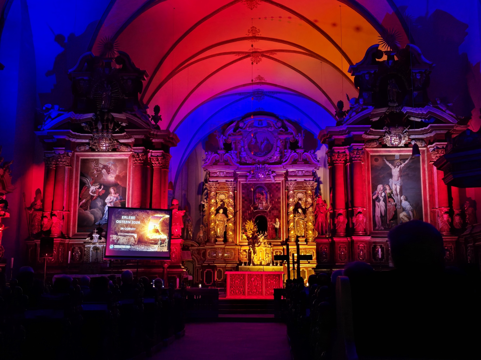 Das österliche Triduum hat in der Welterbestätte Corvey zum zweiten Mal mit seiner zeitgemäßen Gestaltung die Herzen vieler Menschen erreicht. Licht, Musik, Symbole und Impulse führten die Gäste an Gründonnerstag, Karfreitag und in der Osternacht zum Urgrund des christlichen Glaubens. In der Verbundenheit einer Weggemeinschaft haben sie Jesus zum Kreuz begleitet, um schließlich seine Auferstehung zu erleben und den Sieg des Lebens über den Tod zu feiern. Aus Corvey geht von Ostern 2026 eine starke Botschaft aus: „Wir alle sind eingeladen, uns vom Osterlicht erhellen zu lassen und dieses Licht weiterzureichen.“
