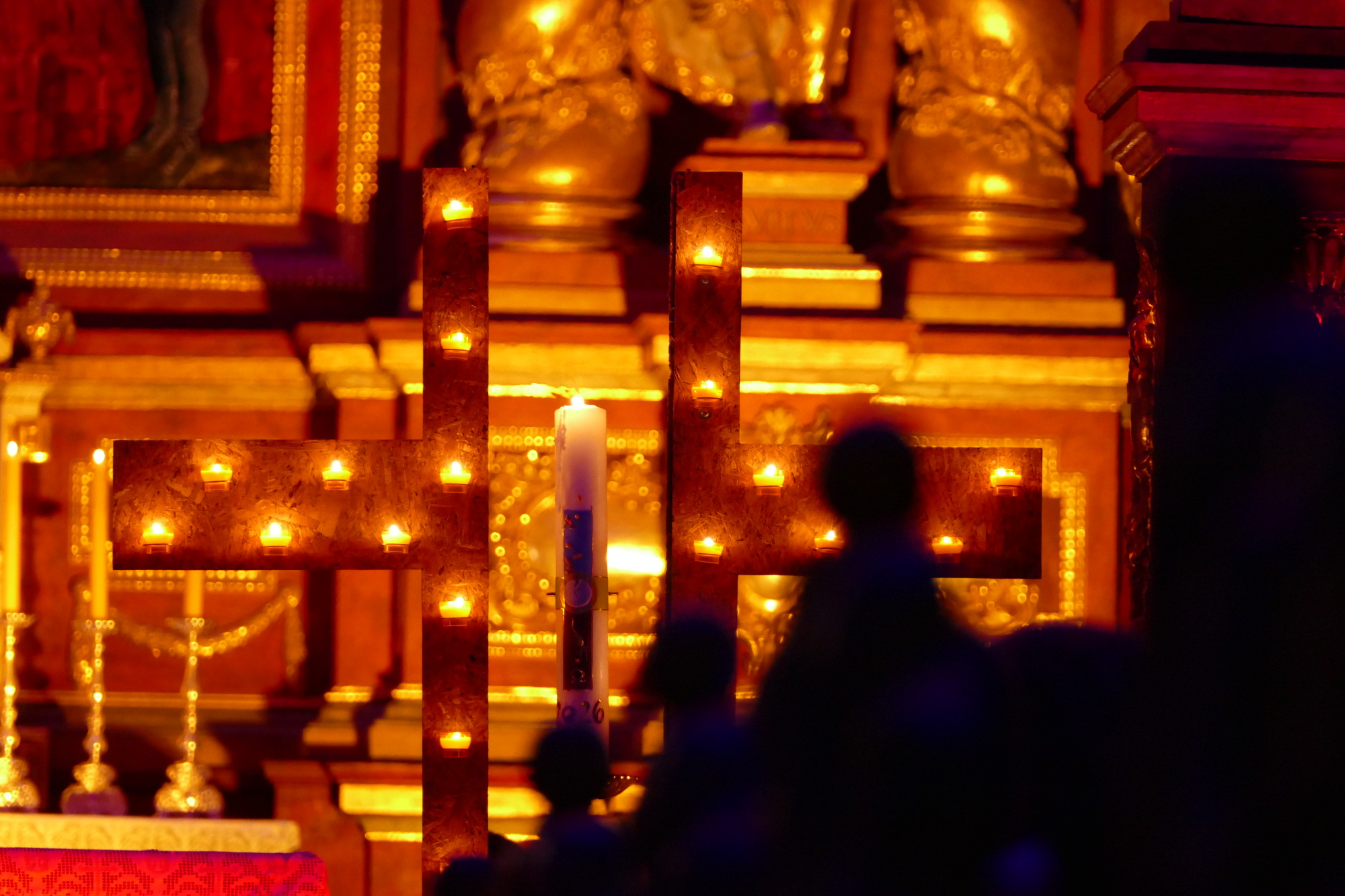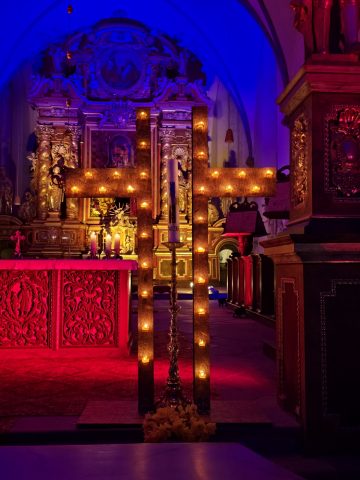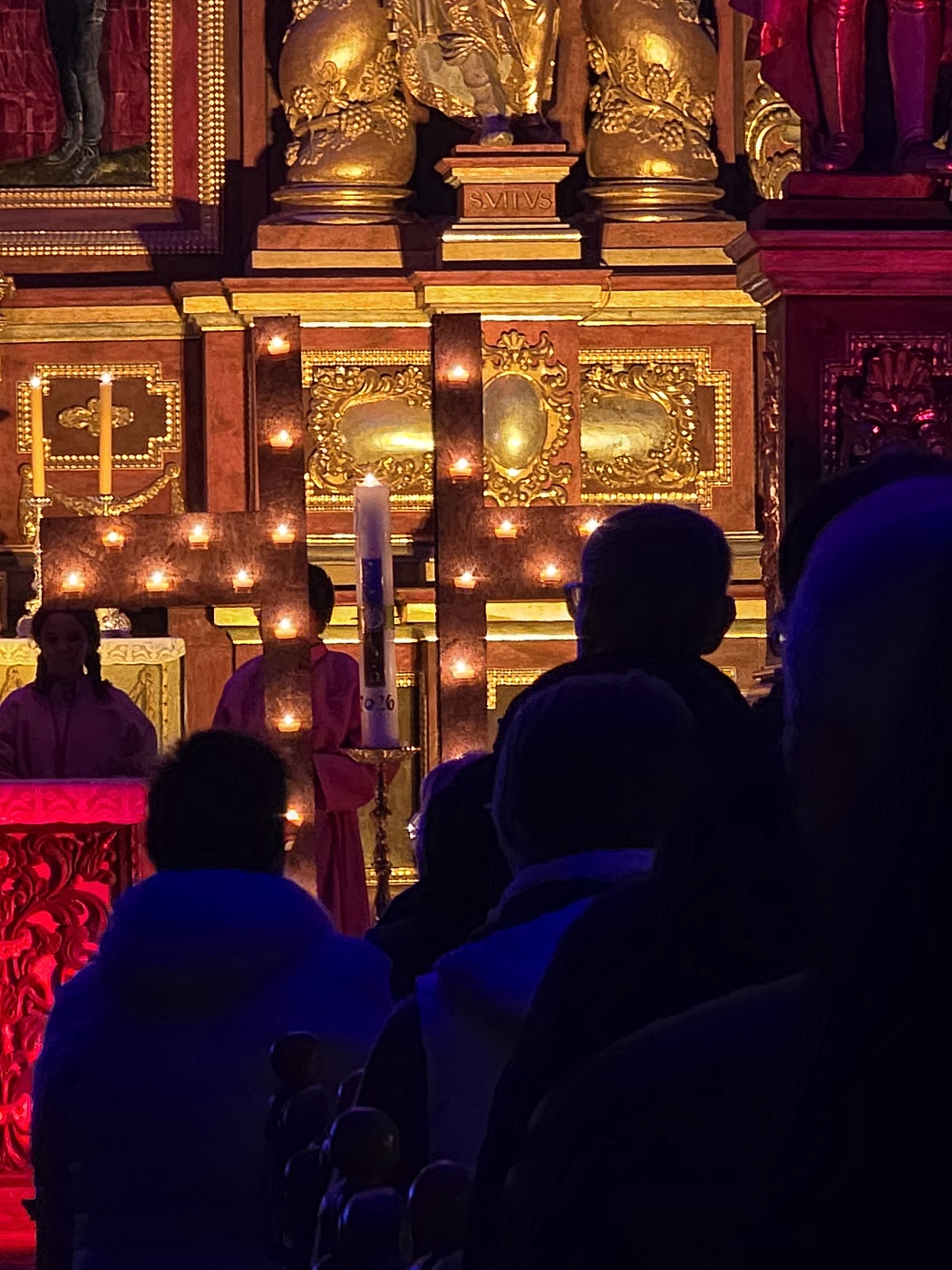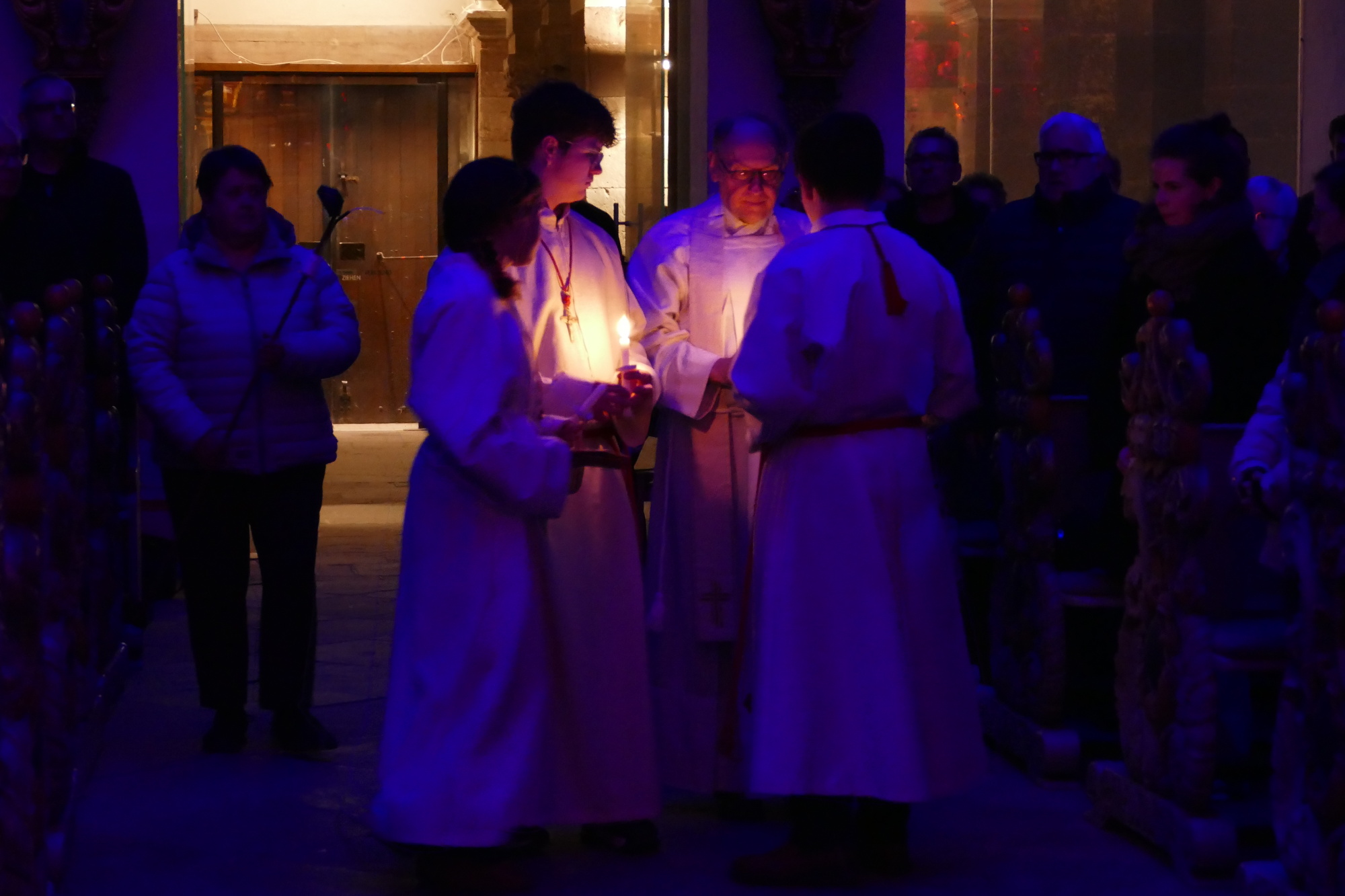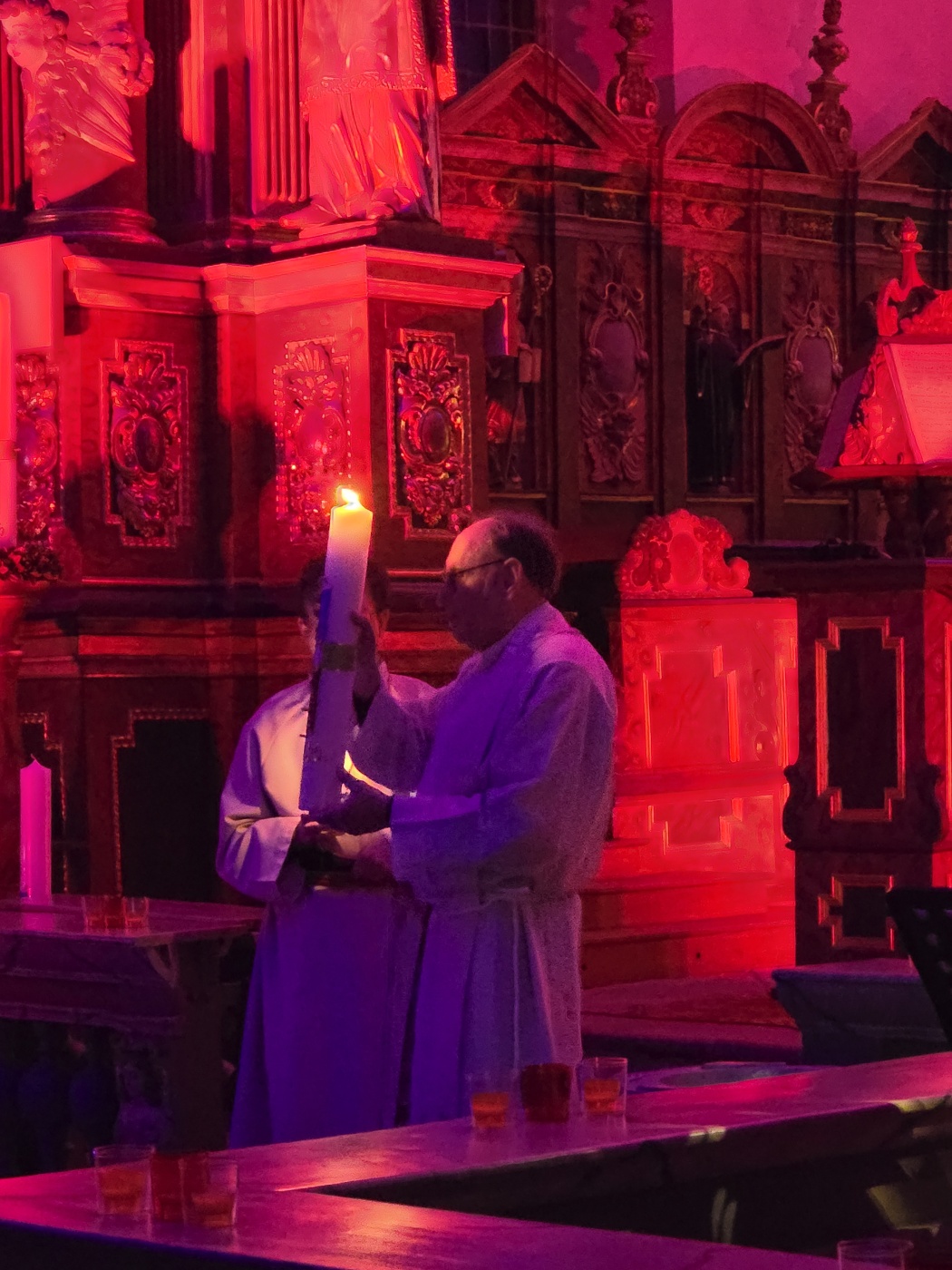 Dieser große Sieg des Lebens über den Tod ist auch in Corvey in der Lichtsymbolik der Osternacht gegenwärtig geworden. Denn an diesem gottgeweihten Ort loderten draußen nicht nur die Flammen des Osterfeuers. In der Kirche leuchtete ein großes Kreuz im Schein vieler Kerzen. Der Längsbalken ist zweigeteilt, um Platz für die Osterkerze zu lassen. Pastor Nal entzündete sie am Osterfeuer, brachte sie in die Kirche und platzierte sie in der Mitte des Kreuzes.