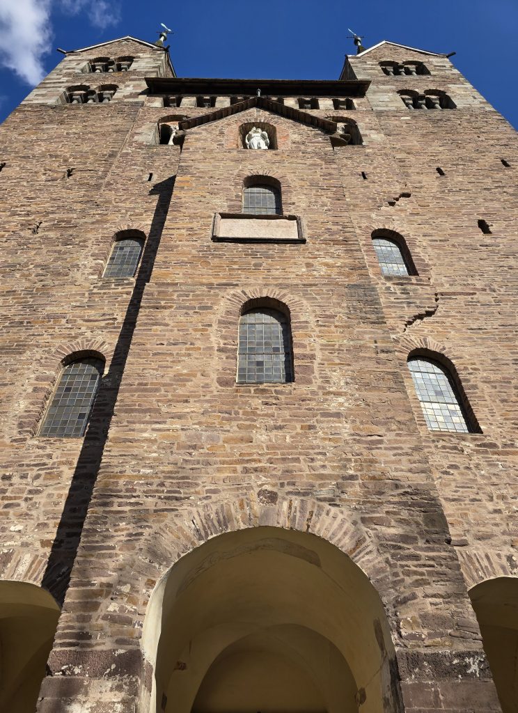 Draußen – an der Doppelturmfassade – künden die Steine des Westwerks von der Mission der Mönche, das Evangelium zu verkünden.