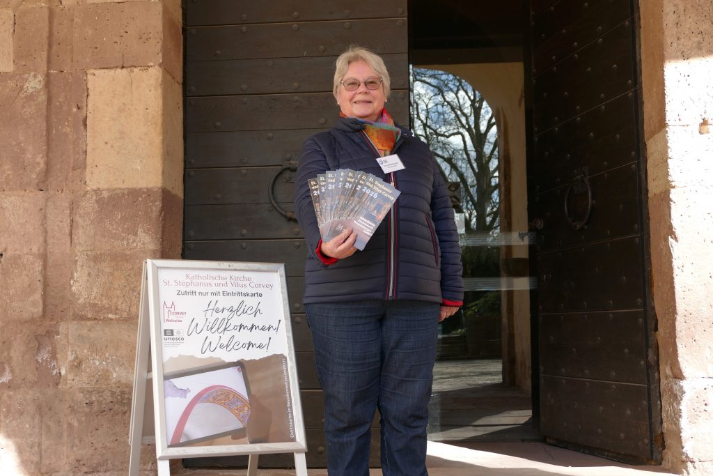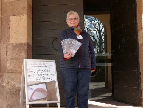 Herzlich willkommen in Corvey: Der Aufsteller draußen weist auf die Digitalangebote der Kirchengemeinde im Westwerk hin. Kirchenaufsicht Beate Werdehausen hat für die Gäste die Programmbroschüre gleich am Tresen griffbereit. Fotos: Kirchengemeinde Corvey/Sabine Robrecht