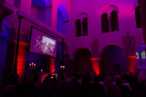 Die Innovationskraft von damals strahlen die Mauern des Westwerks drinnen wie draußen auch nach mehr als 1000 Jahren eindrucksvoll aus. Deshalb gehen (Licht-)farben von heute mit dem frühmittelalterlichen Umfeld eine stimmige Verbindung ein. Diesen Eindruck hat die Feier des letzten Abendmahls am Gründonnerstag 2026 im Johanneschor gemacht: Gemeindereferent Carsten Sperling und Pastor Thomas Nal hatten die Emporenkirche in einen Abendmahlssaal verwandelt und mit Scheinwerfern in stimmungsvolles, mehrfarbiges Licht getaucht.
