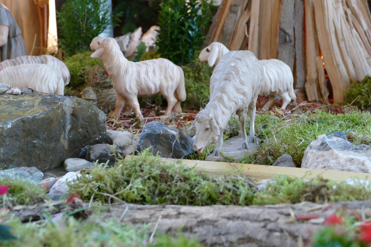 Lächelnd betrachten die Gritzos beim „Endspurt“ der Festvorbereitungen ihre Krippe. Das frische Heu entfaltet dezent seinen natürlichen Duft. In die Stille der Winterruhe in Corvey hinein hört man ein leises Plätschern. Es kommt von einem Rinnsal, aus dem rechts neben dem Stall Wasser fließt. Wie immer trinkt ein Schaf daraus.