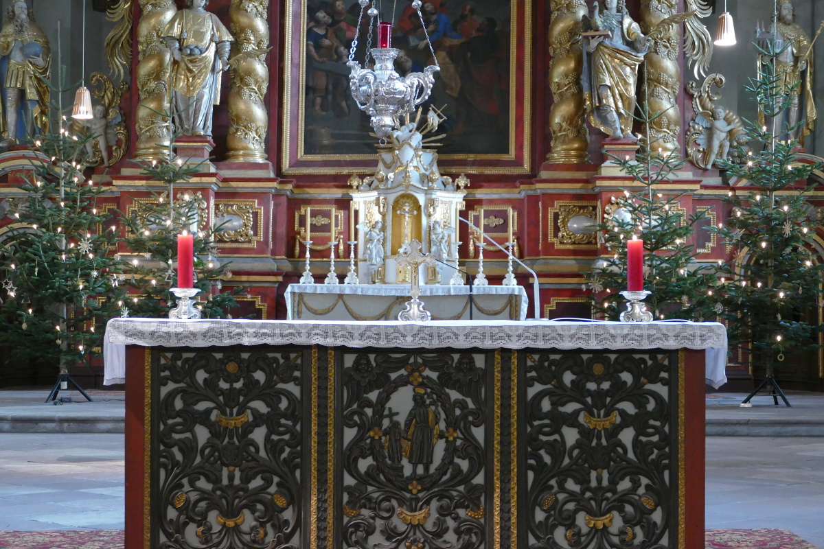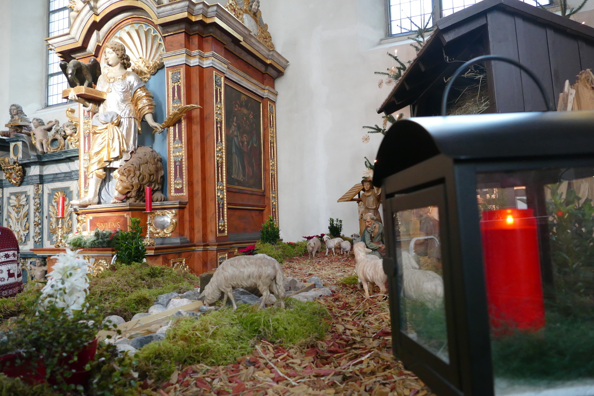 An einem Vormittag kurz vor dem vierten Advent lässt die Wintersonne ihr sanftes, warmes Licht in die geschichtsträchtige Klosterkirche scheinen. Auf dem Unterbau vor dem nördlichen Seitenaltar haben die meisten Krippenfiguren bereits Aufstellung genommen: die Hirten, die Schafe. Maria und Josef. Ochs und Esel. Und natürlich auch der Engel, der der Heiligen Familie in jener Nacht am Stall zur Seite steht.